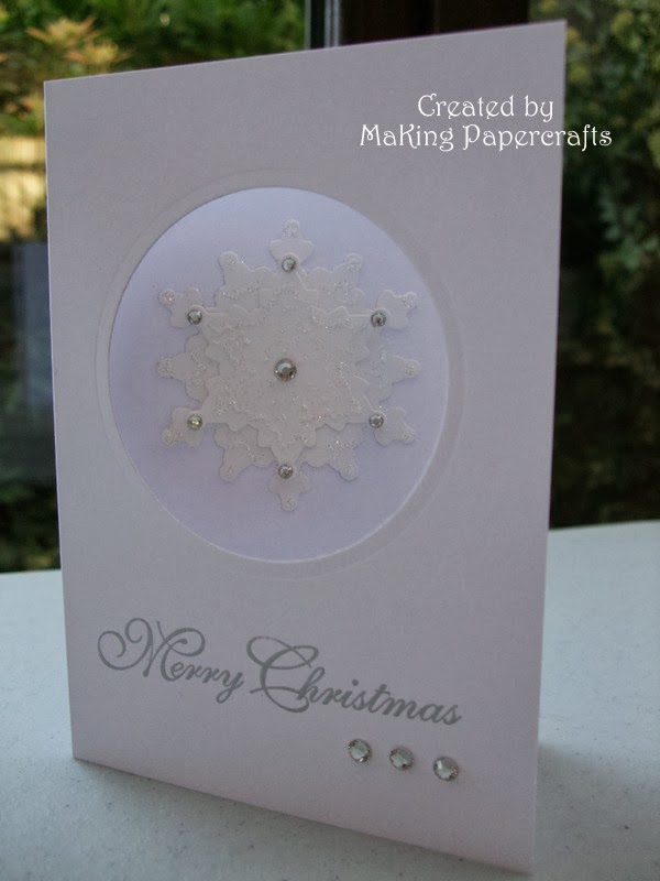 For this one I started with a circular aperture, cut in a white card base, using a Circle Framelits Collection die and silver embossed a sentiment from Greetings of the Season (a carryover set still available from last year's seasonal catalogue). I then cut two snowflakes from the Festive Flurry Framelits, glued one on top of the other and decorated with dazzling Diamonds and Basic Rhinestones. This was positioned inside the card so it shows through the aperture. Three Basic Rhinestones were placed beneath the sentiment to finish the card.